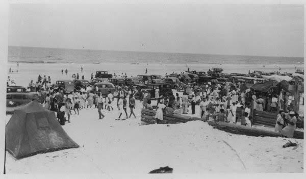 An archived photo image of American Beach in the late 1930’s highlights the origins of beach camping pre-segregation.